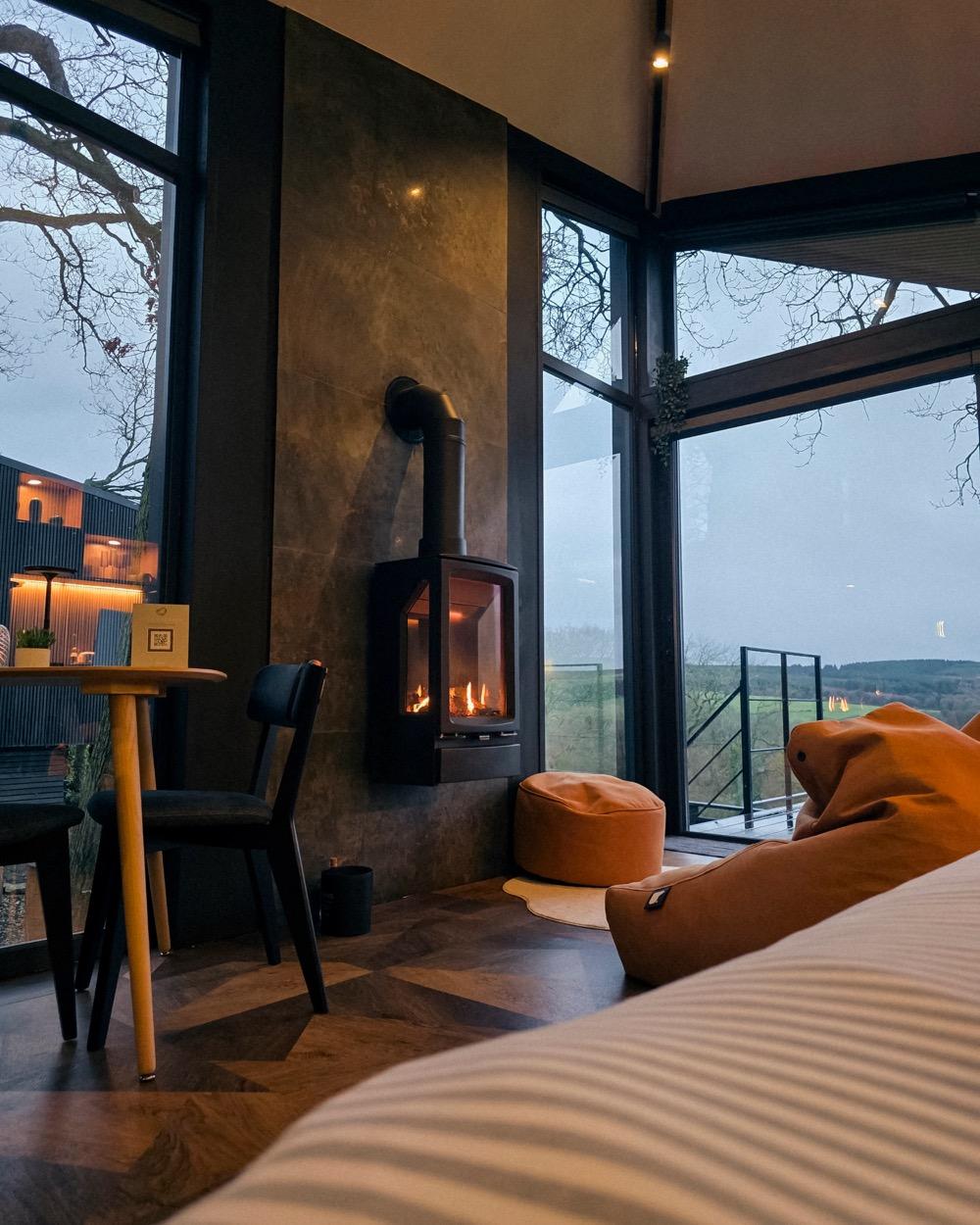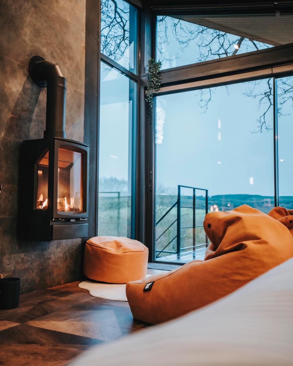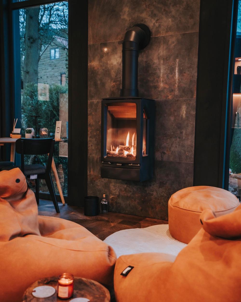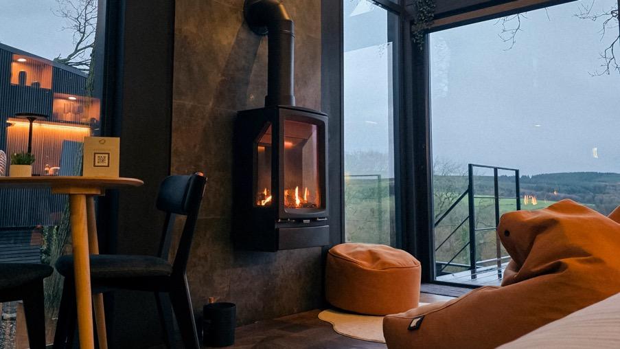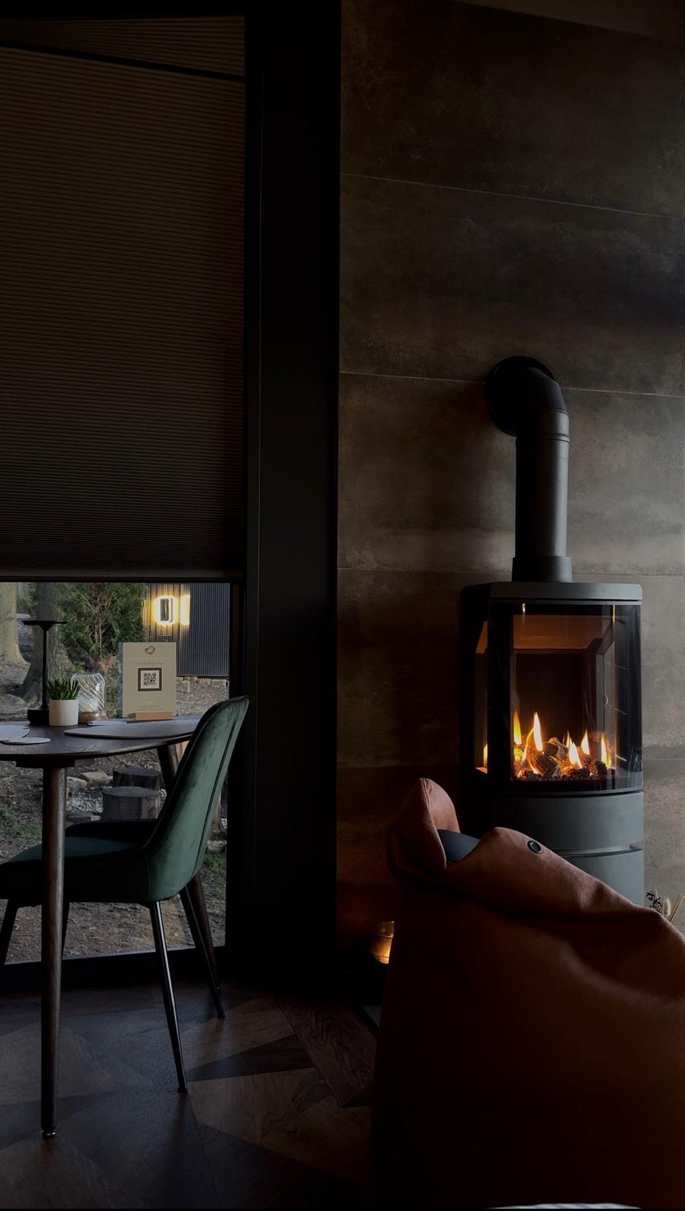 The fires are installed in the main living space of each lodge, positioned against the stone feature wall and directly adjacent to the full-height glazing that looks out across open moorland. The placement was very deliberate — we wanted guests to experience the contrast of the warm flame against the wild landscape beyond the glass. It creates an atmosphere that’s hard to put into words but immediately feels special.