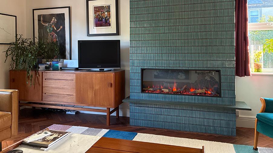Our tiled fireplace with the Gazco electric fire is a lovely focal point in our living room and complements our parquet floor perfectly.