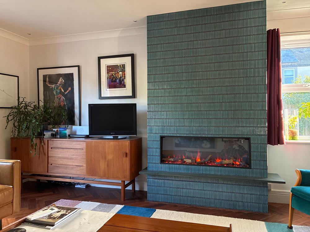 Our tiled fireplace with the Gazco electric fire is a lovely focal point in our living room and complements our parquet floor perfectly.