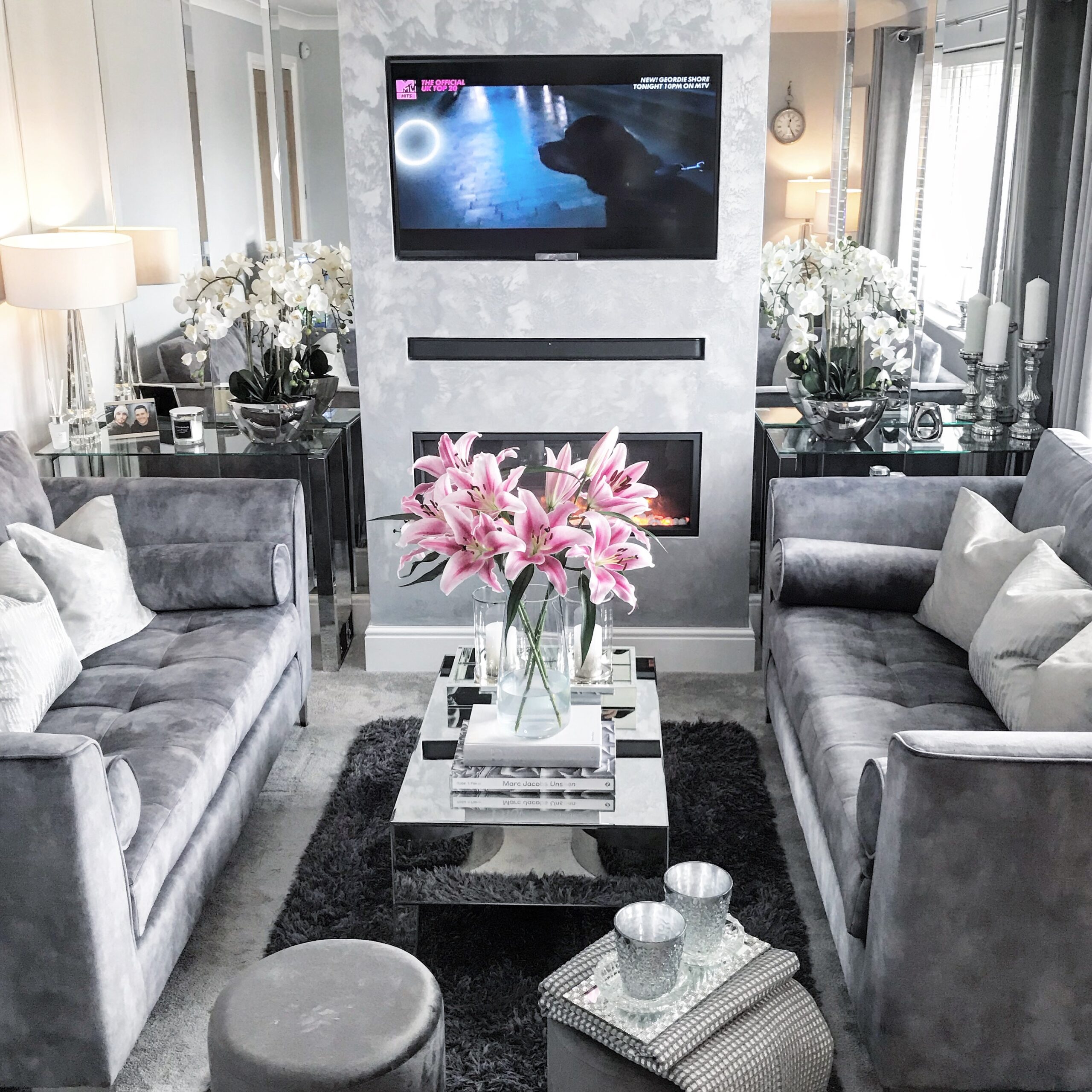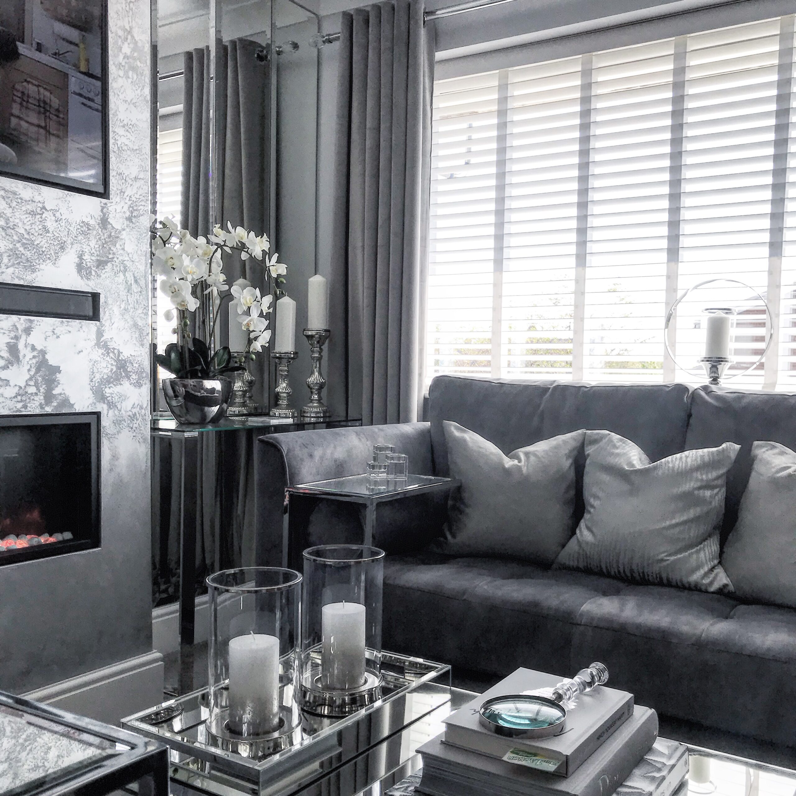 I used to really love our bedroom it was the first room we changed in our renovation, but since doing the living room we have a new favourite. We worked really hard to take away the look of our home being a first floor flat, we wanted something luxurious, glam and classy while still maintaining a masculine feel to the place. My favourite feature of the whole home is the faux chimney breast which houses our tv and Gazco Radiance 85R Inset electric fire. We had it glazed in mirror either side to make the room feel bigger while not taking anything away from the focal point.
