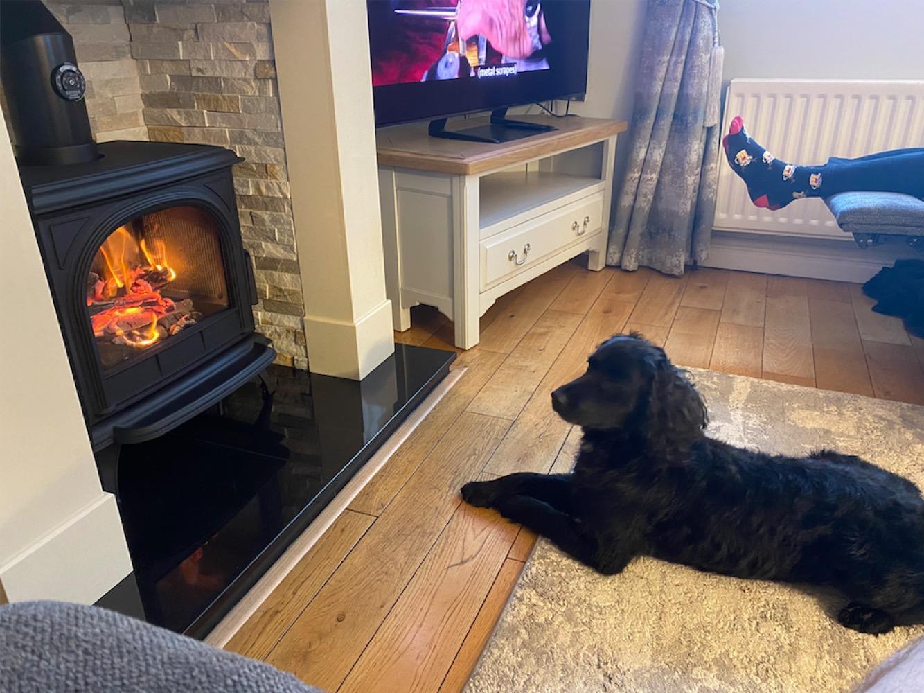 We decided to upgrade our old wood burning stove to the Stovax Huntingdon 30 and it has been thoroughly worth the investment. The Stovax is now the centerpiece to our living room, and we’re really pleased with the finished product. The warmth from the stove is incredible, and it is really keeping us cozy throughout the winter. Anybody who has called in over the months have been quick to admire the overall stove/ surround, and as you can see, ‘George’ approves of it as well. Most nights he will fall asleep in front of the flames.